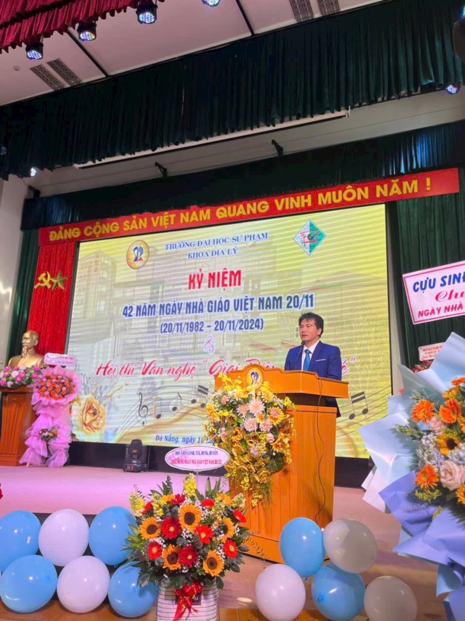 Hoà chung với khí thế tưng bừng, phấn khởi của ngành giáo dục cả nước kỷ niệm 42 năm ngày Nhà giáo Việt nam (20/11/1982 - 20/11/2024) và chào mừng 30 năm ngày thành lập Đại học Đà Nẵng, Khoa Địa lí đã long trọng tổ chức chương trình “Kỷ niệm ngày Nhà giáo Việt Nam 20-11” và Hội thi văn nghệ “Giai điệu tuổi trẻ” tại Hội trường A5 - Trường Đại học Sư phạm - Đại học Đà Nẵng