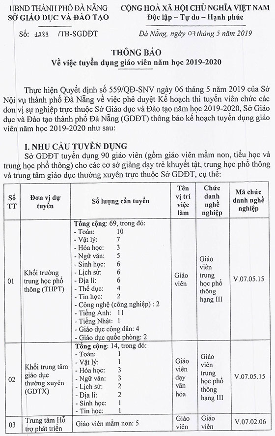 Sở giáo dục và Đào tạo TP.Đà Nẵng tuyển dụng giáo viên năm học 2019 – 2020 như sau: 1. Chỉ tiêu tuyển dụng: 90 chỉ tiêu, trong đó: – Khối trường THPT: 69 chỉ tiêu. – Khối Trung tâm GDTX: 14 chỉ tiêu. – Trung tâm Hỗ trợ phát triển giáo dục hòa nhập ĐN: 05 chỉ tiêu. – Trường Chuyên biệt Tương Lai: 02 chỉ tiêu. 2. Hình thức tuyển dụng: Thi tuyển. 3. Thời gian, địa điểm nhận hồ sơ dự tuyển: – Thời gian: Kể từ ngày 07/05/2019 đến hết ngày 05/06/2019. – Địa điểm: Sở Giáo dục và Đào tạo TP. Đà Nẵng.